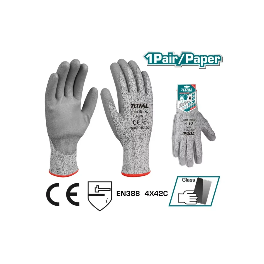 Перчатки для защиты от порезов TOTAL TSP1701 обладают повышенной износостойкостью за счет того, что изготовлены из полиэтиленовых нитей. Чтобы надежно удерживать масляные и жирные детали, предусмотрено полиуретановое покрытие. Эластичная манжета для плотного прилегания к запястью. Эта модель имеет высший класс защиты от порезов 5.