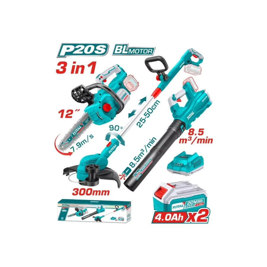комплект из 3 предметов аккумуляторной цепной пилой, триммером для травы, воздуходувом total tosli241189